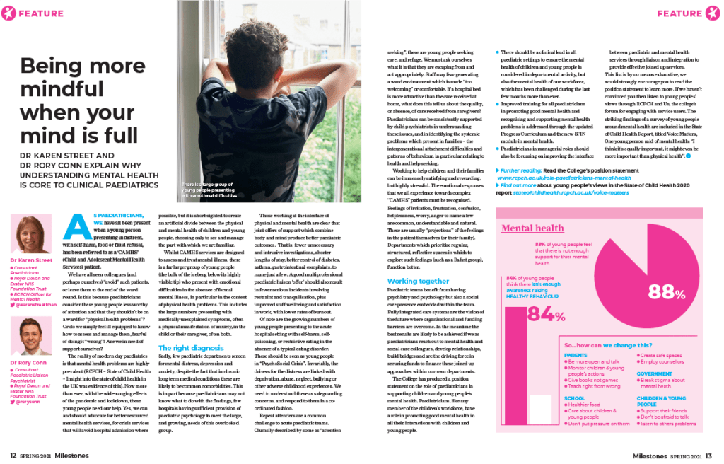 I wrote this piece for the Royal College of Paediatrics (Milestones, Spring 2021), alongside Dr Karen Street, lead for mental health at RCPCH. In it, we advocate for better mental health support on paediatric wards, and the importance of joint working. You can download the full article here: